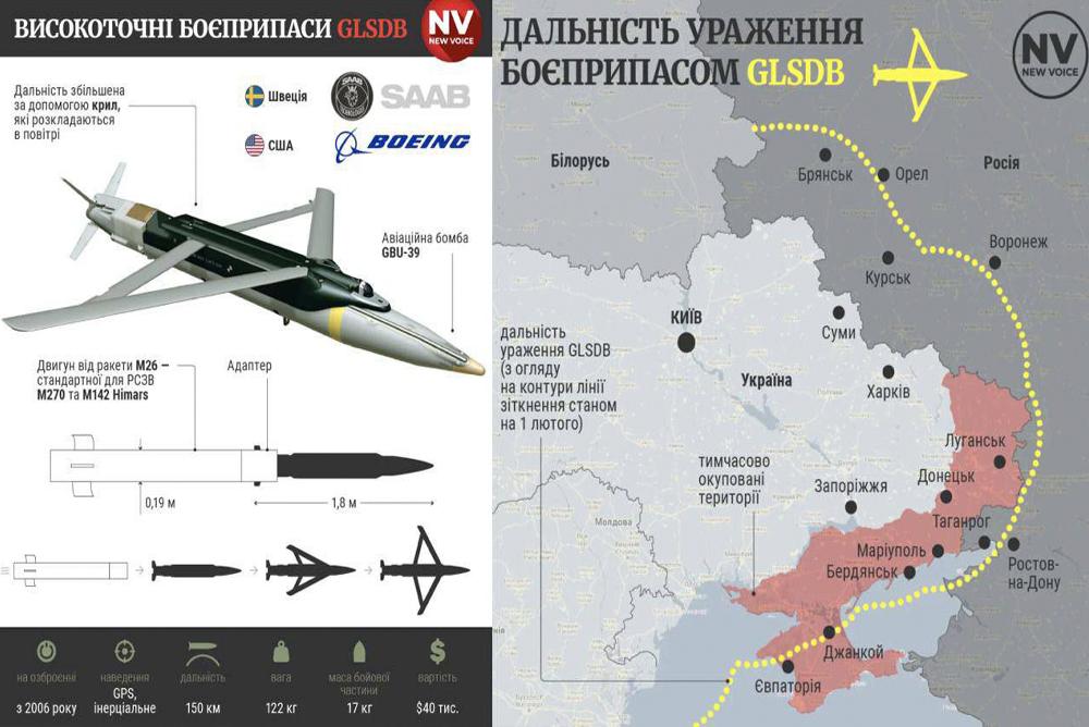 - Увеличенная дальность: Благодаря аэродинамической форме и использованию технологий планирующих боеприпасов, GLSDB может поражать цели на значительных расстояниях до 150 км.